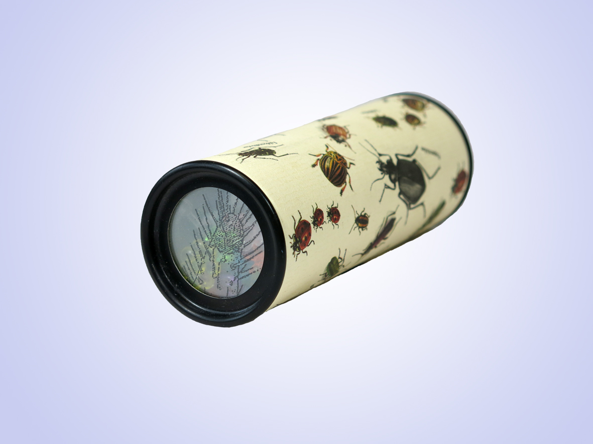 Kaleidoskop mit integrierter Objektkammer, gefüllt mit Kunststoffobjekten