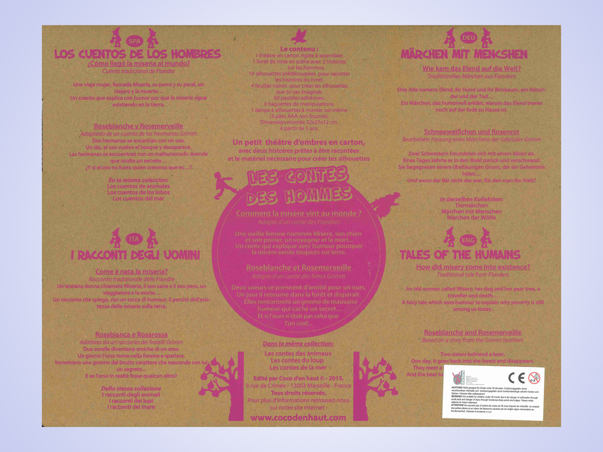 Bestehend aus: 1* Proszenium zerlegbar, 19 Schattenfiguren, 3 Spielstäbe mit Griff, Anleitung mit Märchen zum Nacherzählen "Wie kam das Elend auf die Welt" und „Schneeweißchen und Rosenrot“