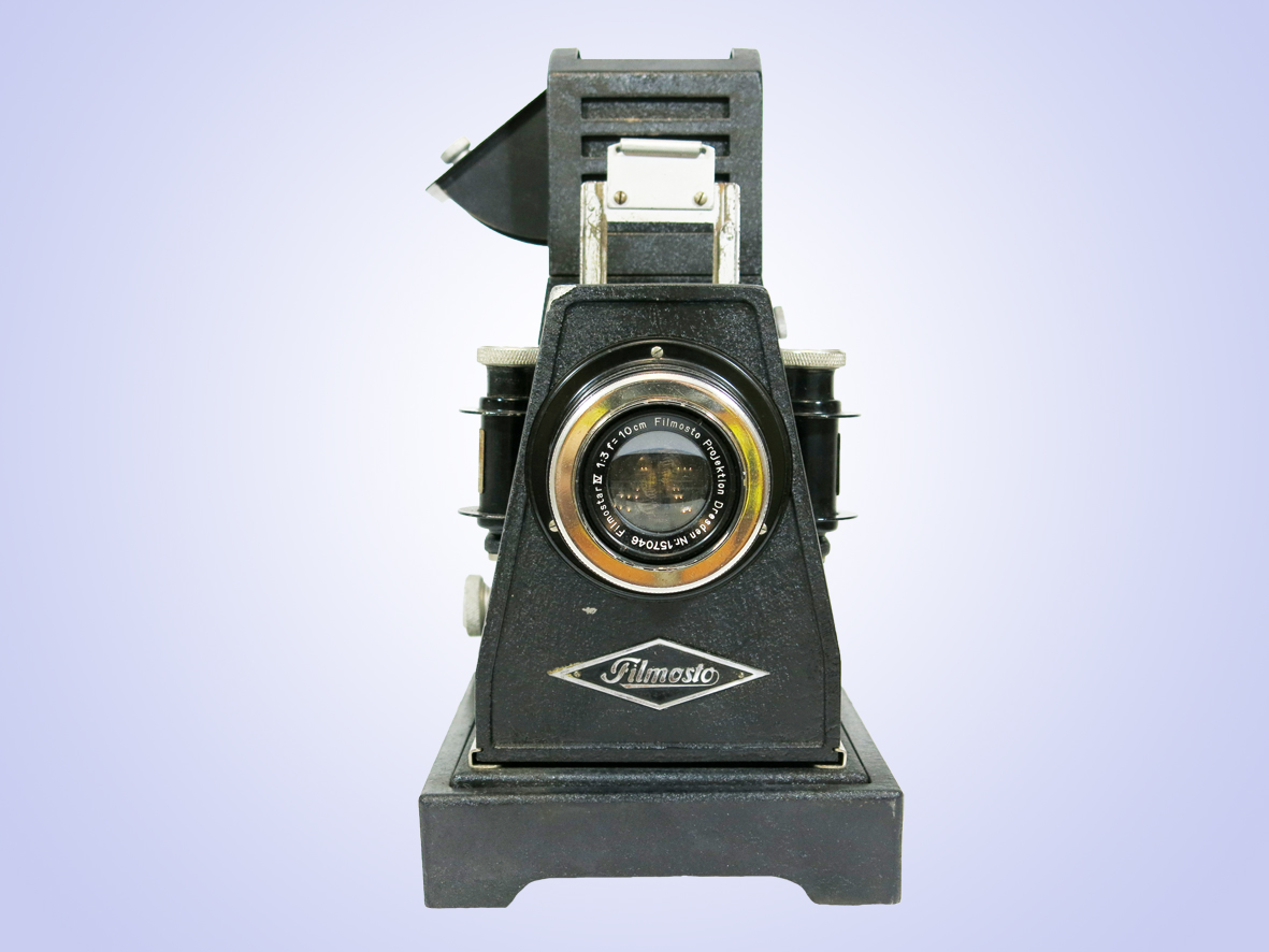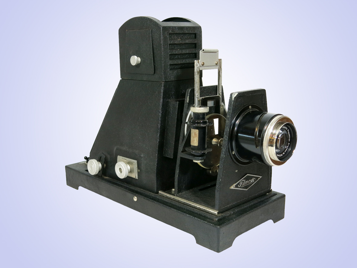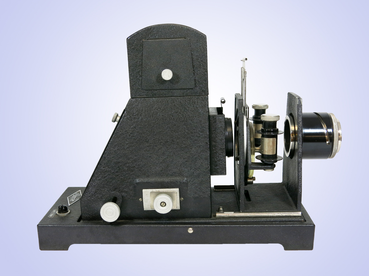Projektor für 35mm- Rollfilme, über Blende in den Formaten 18x24 und 24x36, einstellbar.