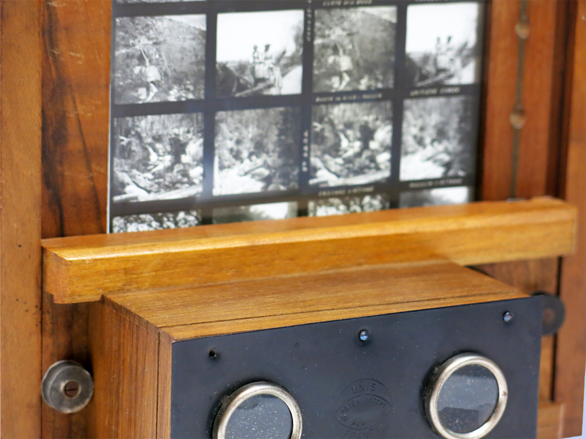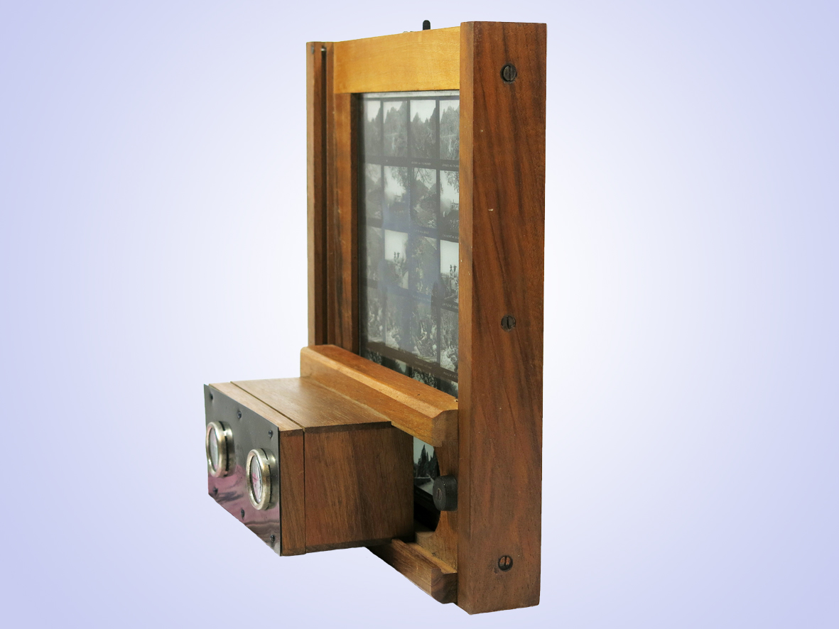Die Betrachtung der einzelnen Bildpaare erfolgt durch horizontale und vertikale Verschiebung des Betrachters im Holzrahmen