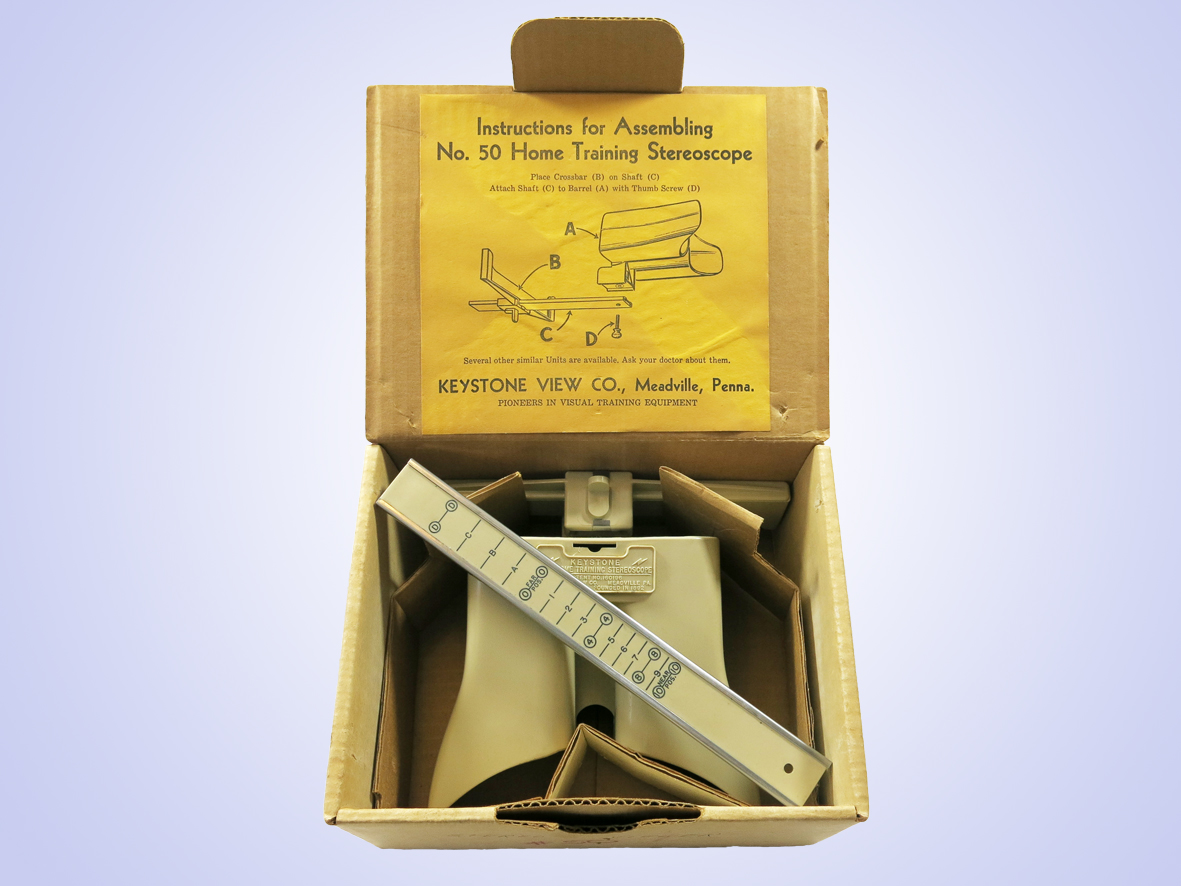 Das Stereoskop ist für die Anwendung zu Hause zur Verbesserung des Sehvermögens konzipiert. Typischerweise war es Teil eines Sets mit einer Anleitung und speziell entwickelten Stereobildkarten. Der Schaft des Stereoskops ist mit Markierungen für verschiedene Entfernungen versehen, und die Karten tragen nummerierte Etiketten, die den Übungen in der Anleitung entsprechen. Diverse Farbvarianten bekannt sowie eine Variante mit Ständer.