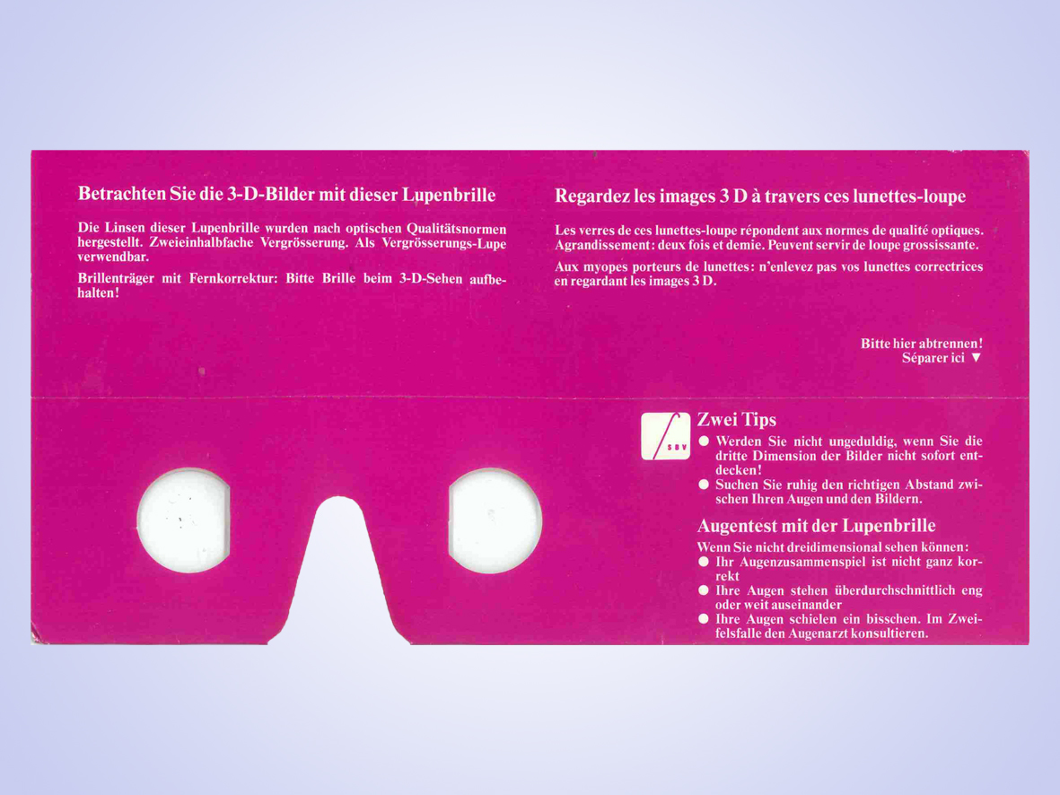 Einschl. einer gefalteten und beidseitig bedruckten Beschreibung über 3-dimensionales Sehen mit 8 Stereobildern.