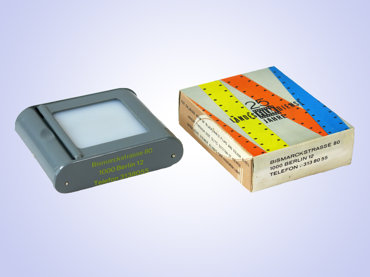 Hersteller HW aus Hong Kong, original Verpackung beklebt mit der Werbung des Landesfilmdienstes, Original Bezeichnung „Handy Slide Viewer“