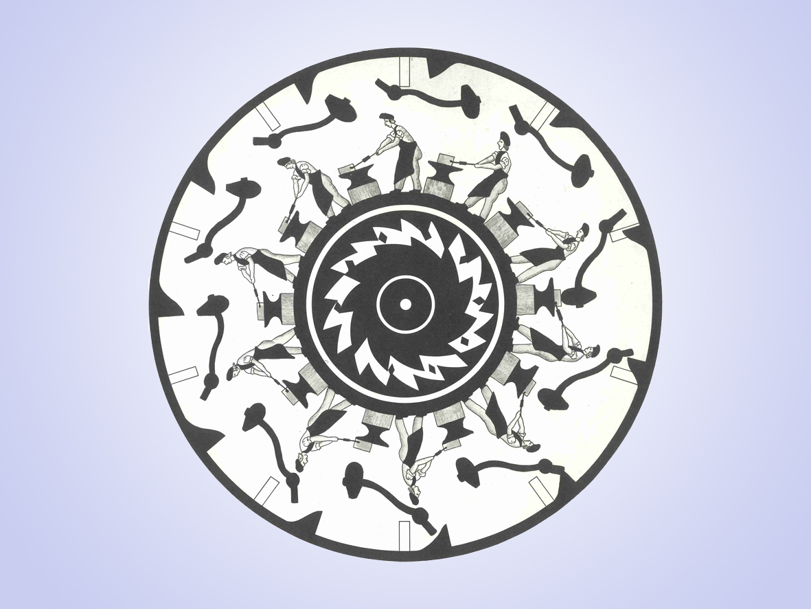 Der Betrachter stellt sich vor einem Spiegel und betrachtet die Scheibenseite mit den Bewegungsabläufen im Spiegelbild durch die Schlitze der schwarzen Seite.