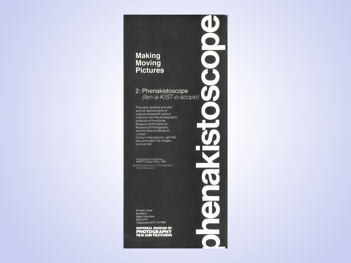 Das Phenakistiskop besteht aus einem Griff, auf dem eine Schlitzscheibe montiert ist, welche in Drehung versetzt wird. Auf der Scheibe sind auf einer Seite Zeichnungen von Bewegungsphasen kreisförmig angeordnet. Die andere Seite ist schwarz.