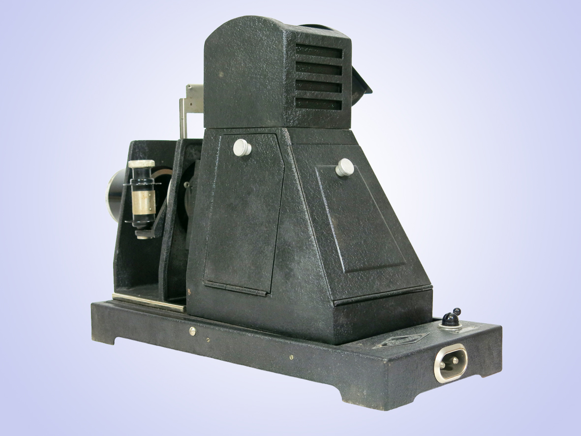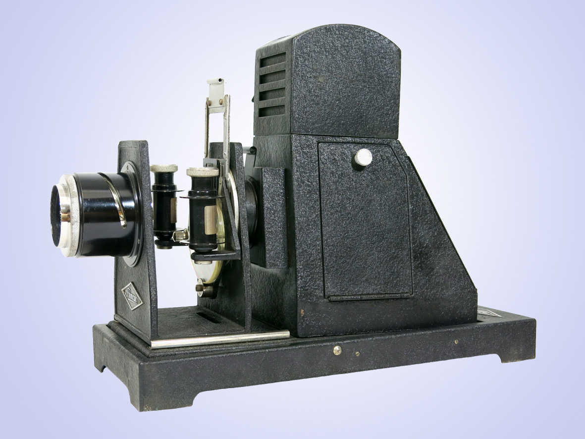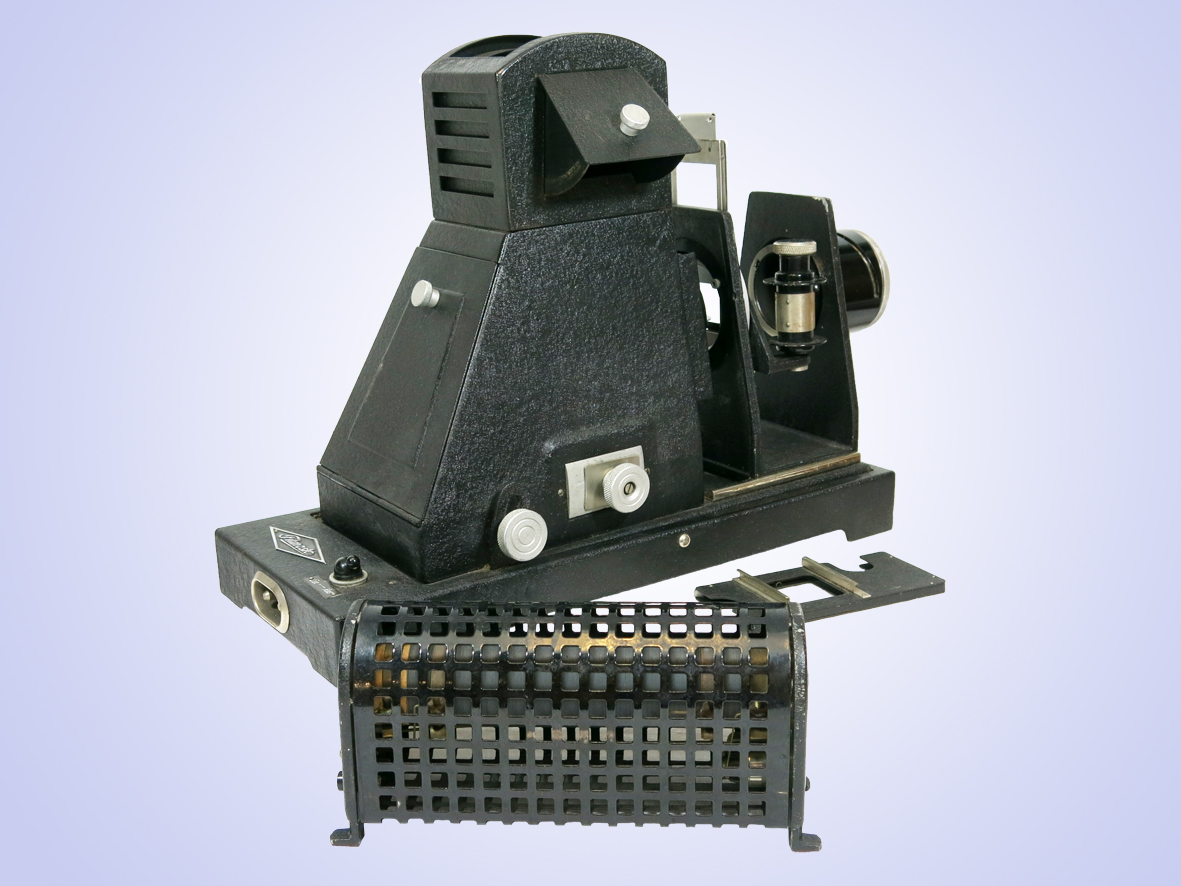Projektor für 35mm- Rollfilme, über Blende in den Formaten 18x24 und 24x36, einstellbar.