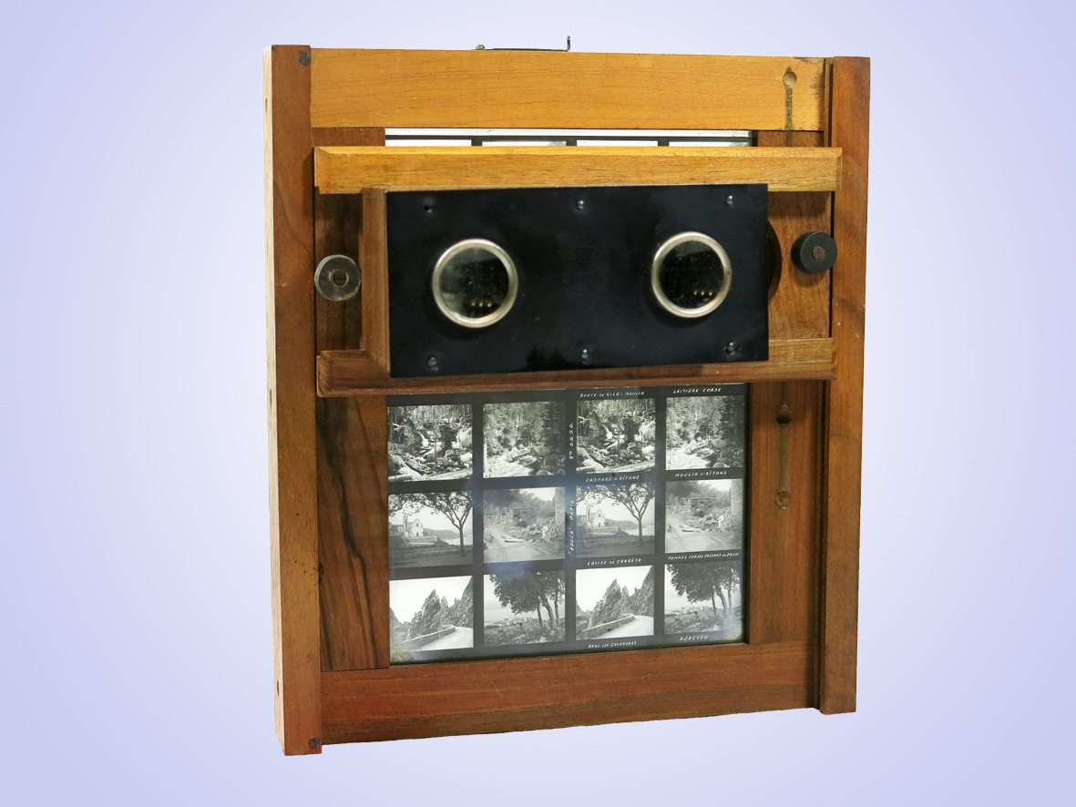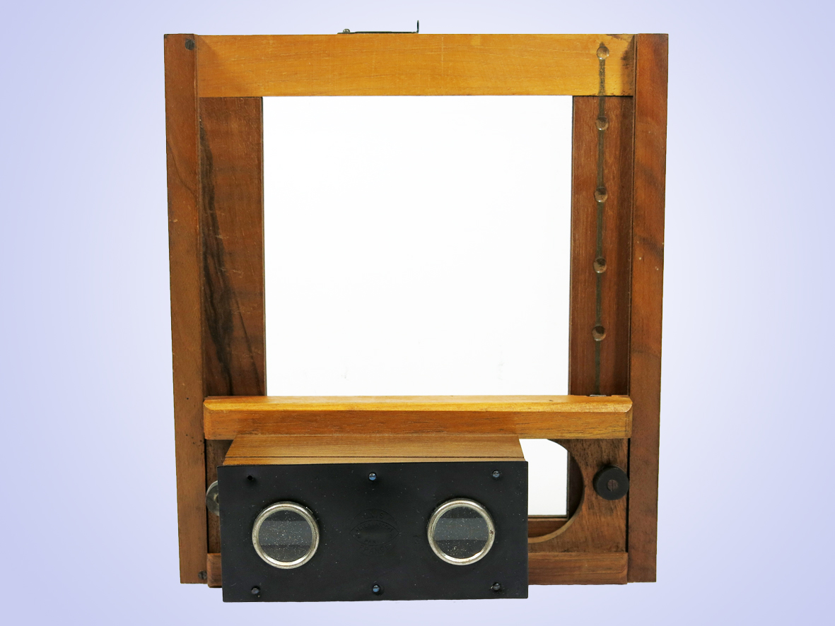 Die Betrachtung der einzelnen Bildpaare erfolgt durch horizontale und vertikale Verschiebung des Betrachters im Holzrahmen