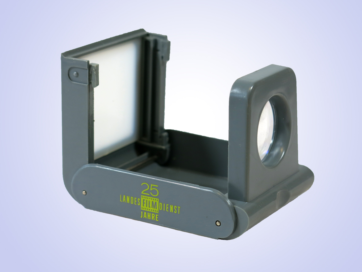 Hersteller HW aus Hong Kong, original Verpackung beklebt mit der Werbung des Landesfilmdienstes, Original Bezeichnung „Handy Slide Viewer“
